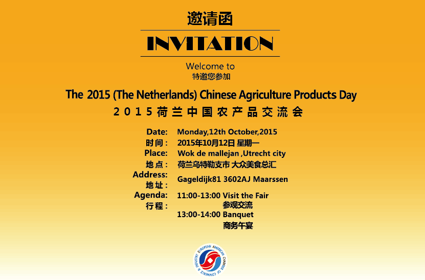 欧美工商会作为荷兰的组织单位,诚意邀请正在经营超市和经营中国产品的超市以及农副产品进出口贸易商前来参加此次中国农产品交流会。 届时您将与30多位来自于中国的优秀农业畜牧业产品的企业家见面并洽谈,并看到他们带来的实物展示。