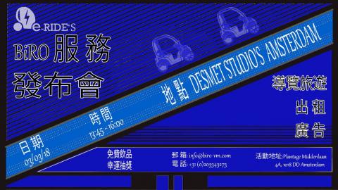 E-ride 代表简单(Easy),电动(Electric)和有趣(Entertaining)的出行,BiRO正是这3E特征的代表。BiRO是由意大利制造的100%纯电动汽车,车身小巧,驾驶简单。它在保护环境的同时,还在节省时间、金钱和空间的方面大有优势。可以说,它是另一种简单而便捷的出行方式,并且它还能让您的旅途免受荷兰恶劣天气的影响。