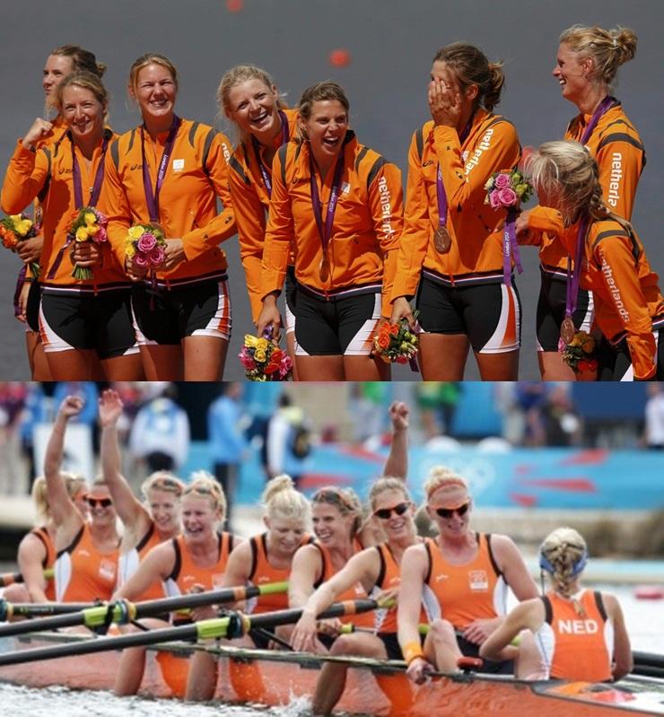 LONDON, ENGLAND - AUGUST 02: Anne Schellekens, Annemiek de Haan, Carline Bouw, Claudia Belderbos, Roline Repelaer van Driel, Sytske de Groot, Chantal Achterberg, Nienke Kingma and Jacobine Veenhoven of the Netherlands celebrate after winning the bronze medal for he Women's Eight rowing on Day 6 of the London 2012 Olympic Games at Eton Dorney on August 2, 2012 in Windsor, England.